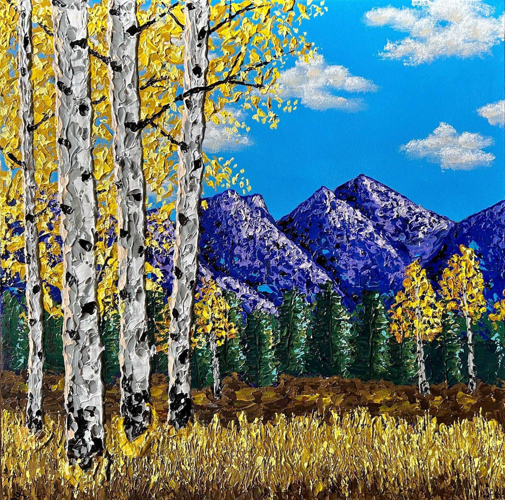This looks like a perfect Happy Place. Only thing missing is me! Surrounded by majestic mountains, blue skies and the colors of fall. It makes my heart sing. I use palette knives and modeling paste to provide a unique texture to these paintings that is not only visual, but touchable. Don't be afraid to experience this with your fingertips too.
