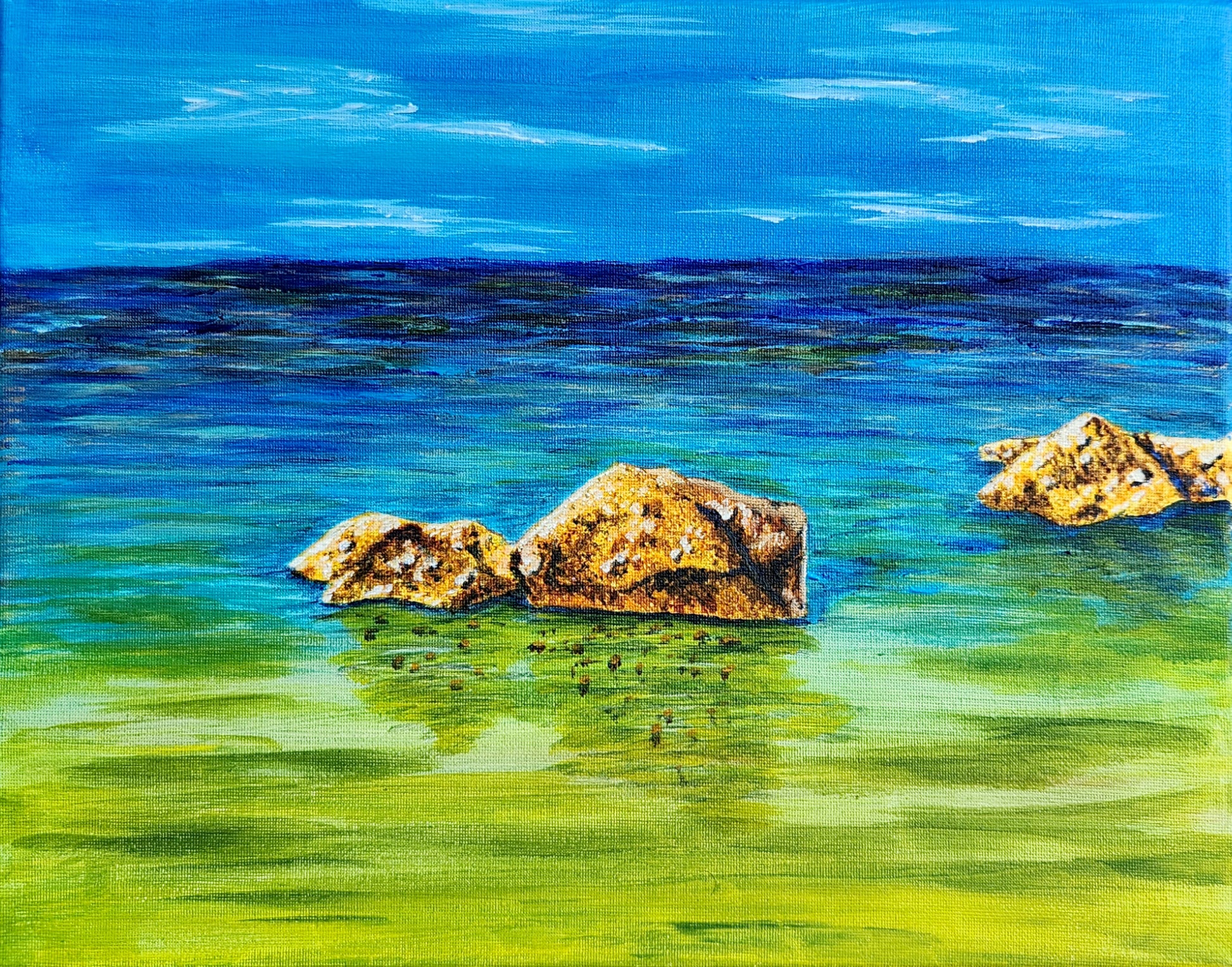 I liked the contrast of rugged rocks against relatively calm water. I imagine the different life that takes place in the different layers of the water. Larger animals in the deeper blue to smaller ones in the closer green tinted waters. The rocks stand watch as they play below the surface.
