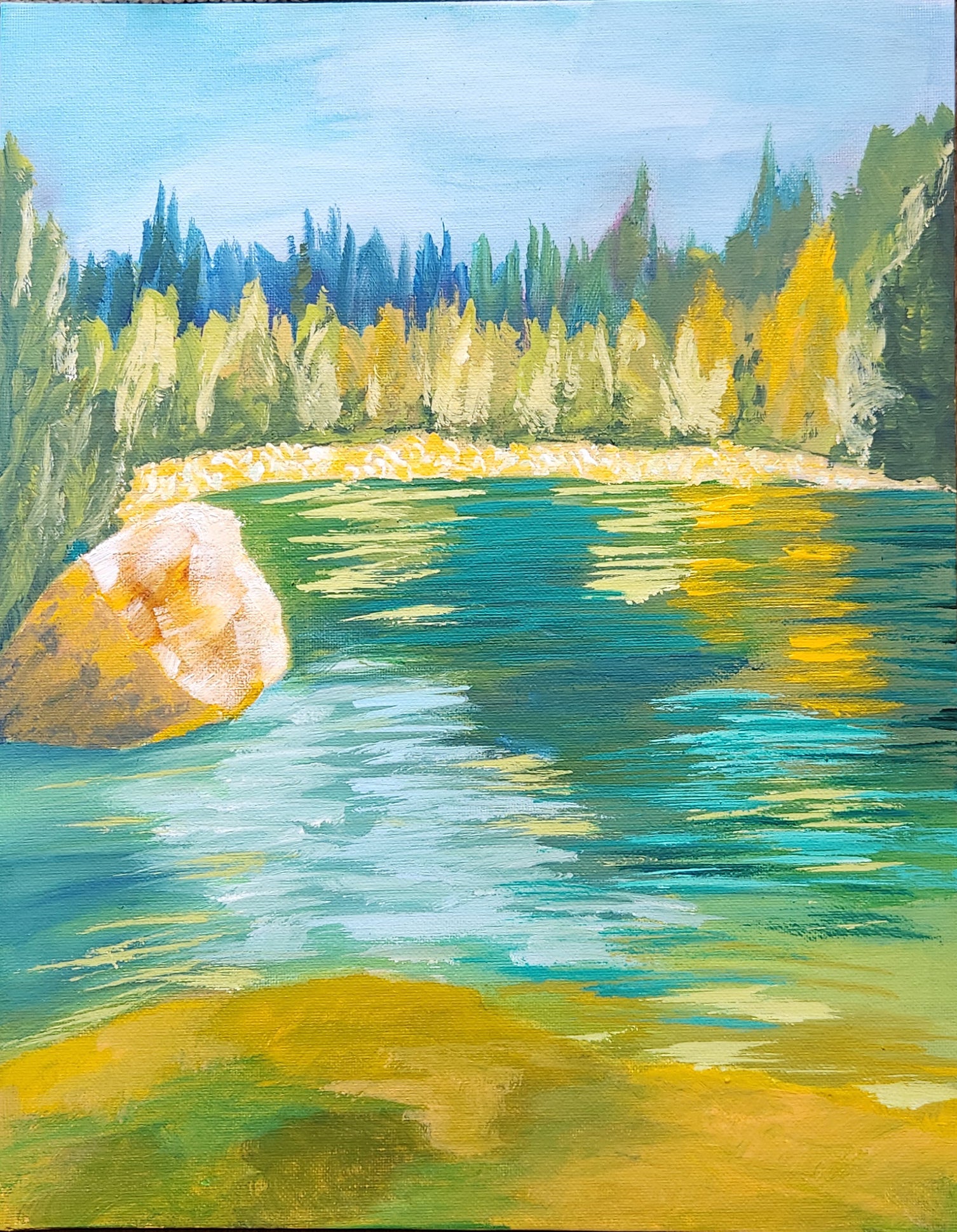 Panels are the perfect size and format to get playful. Look at the colorful trees and the way they reflect in the nearby pond. The colors "rocked" back and forth with the waves. While I could see the movement, I also sensed the weight of the objects like the trees and the rock.