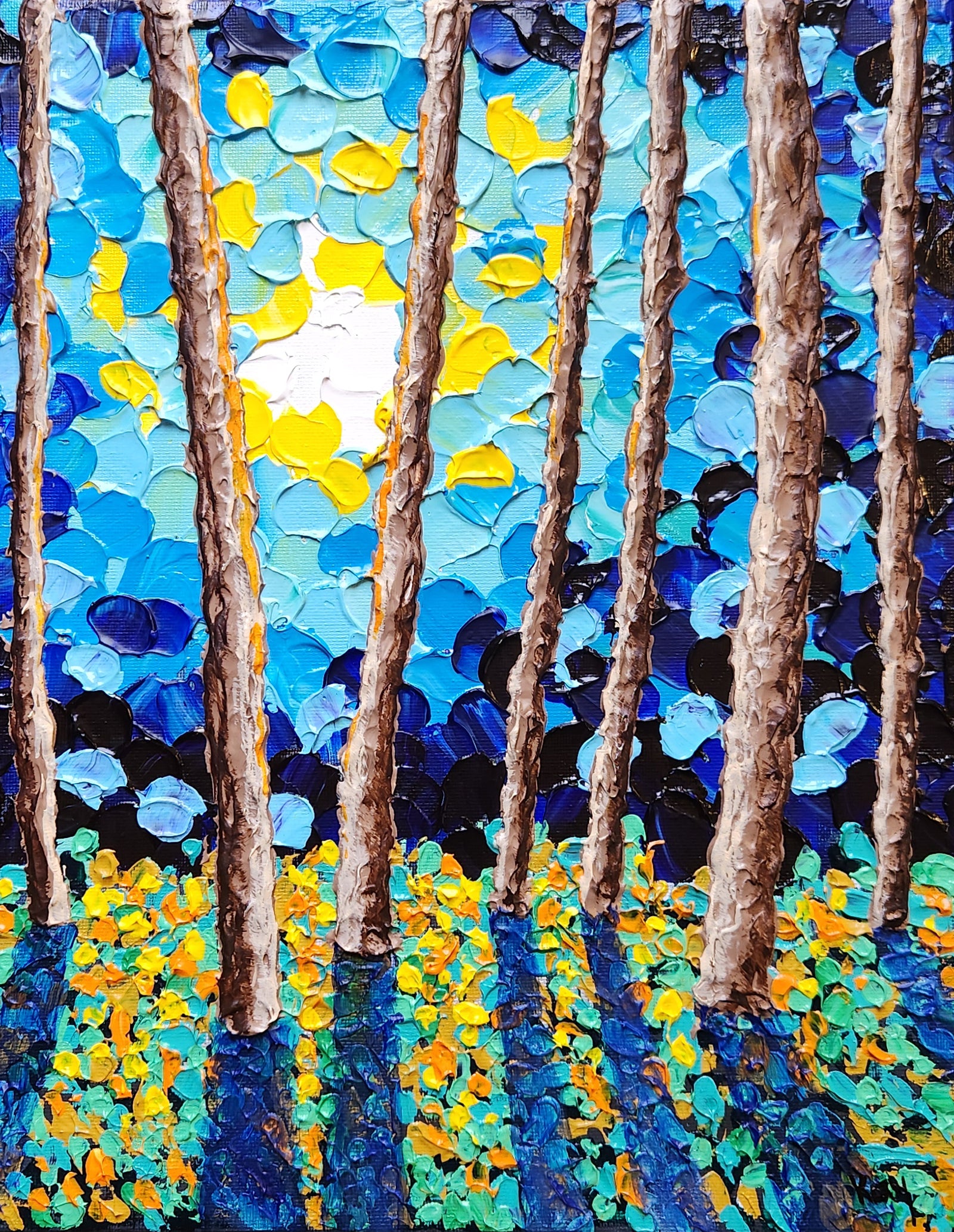 Seven trees stand the test of time against this textured background. It was fun to see the layers build and the colors blend with the eye, not on the palette. While I do a lot of Aspe and Birch trees, I thought these looked better with the softer earthtones. It makes me feel calm and edgy at the same time.